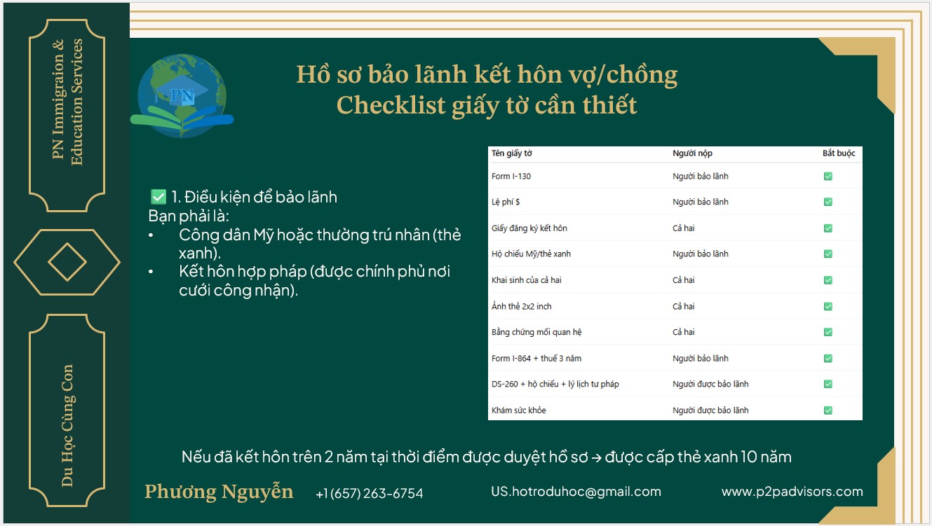 Để bảo lãnh vợ hoặc chồng sang Mỹ định cư theo diện hôn nhân, bạn cần chuẩn bị một bộ hồ sơ bảo lãnh di trú vợ/chồng đầy đủ, chính xác và có bằng chứng mối quan hệ thật sự.