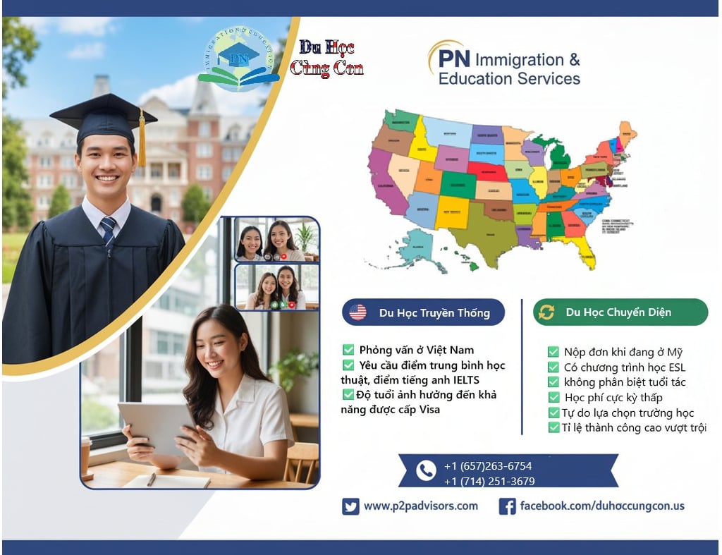 🇺🇸 DU HỌC MỸ: CHUYỂN DIỆN TỪ MỸ HAY TRUYỀN THỐNG TỪ VIỆT NAM? 🤔 Lựa chọn nào TỐI ƯU cho bạn? Nhiều phụ huynh và học sinh thường băn khoăn giữa hai hình thức phổ biến: Du học chuyển diện khi đang ở Mỹ từ visa L1/J1/B1/B2..) và Du học truyền thống phỏng vấn từ Việt Nam. Đâu là lựa chọn phù hợp nhất cho bạn? Hãy cùng PN Immigration & Education Services phân tích chi tiết !