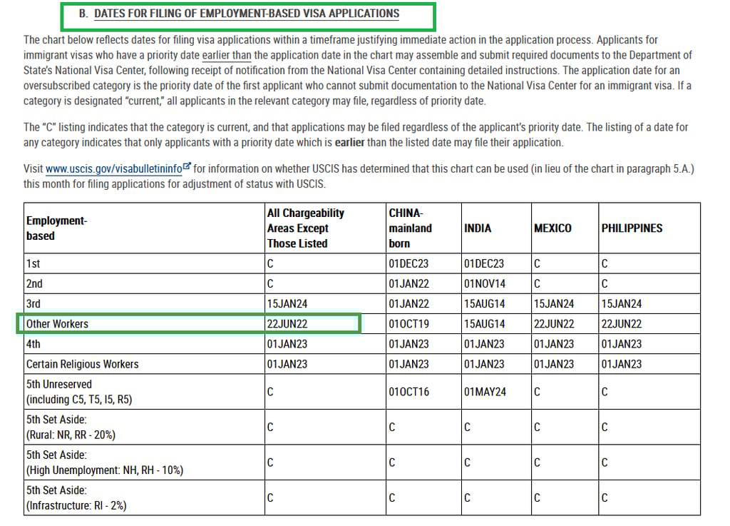 According to the March 2026 Visa Bulletin published by the U.S. Department of State, the EB-3 Other Workers category has advanced significantly. Currently, applicants with a Priority Date before June 22, 2022 are permitted to file Form I-485 (Adjustment of Status) if they are lawfully present in the United States.
