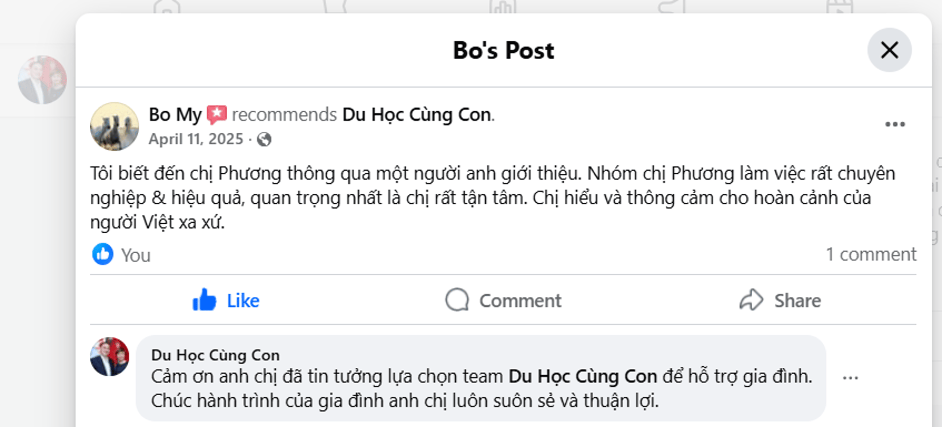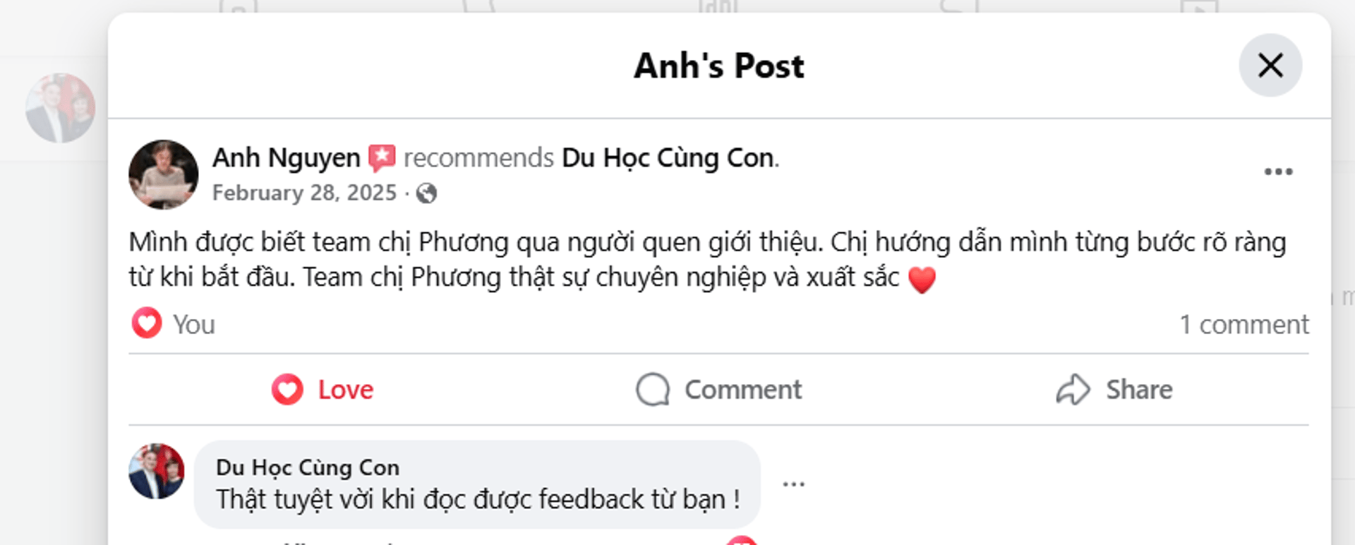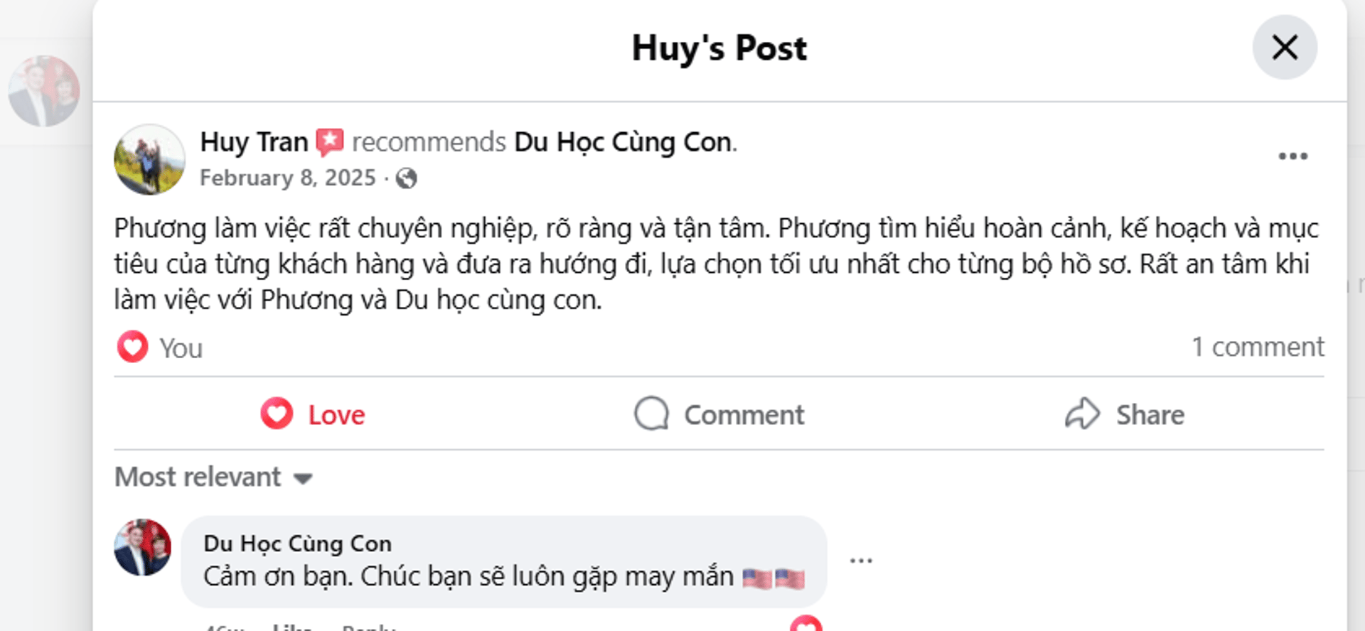 Phương làm việc rất chuyên nghiệp, rõ ràng và tận tâm. Phương tìm hiểu hoàn cảnh, kế hoạch và mục tiêu của từng khách hàng và đưa ra hướng đi, lựa chọn tối ưu nhất cho từng bộ hồ sơ. Rất an tâm khi làm việc với Phương và Du học cùng con.