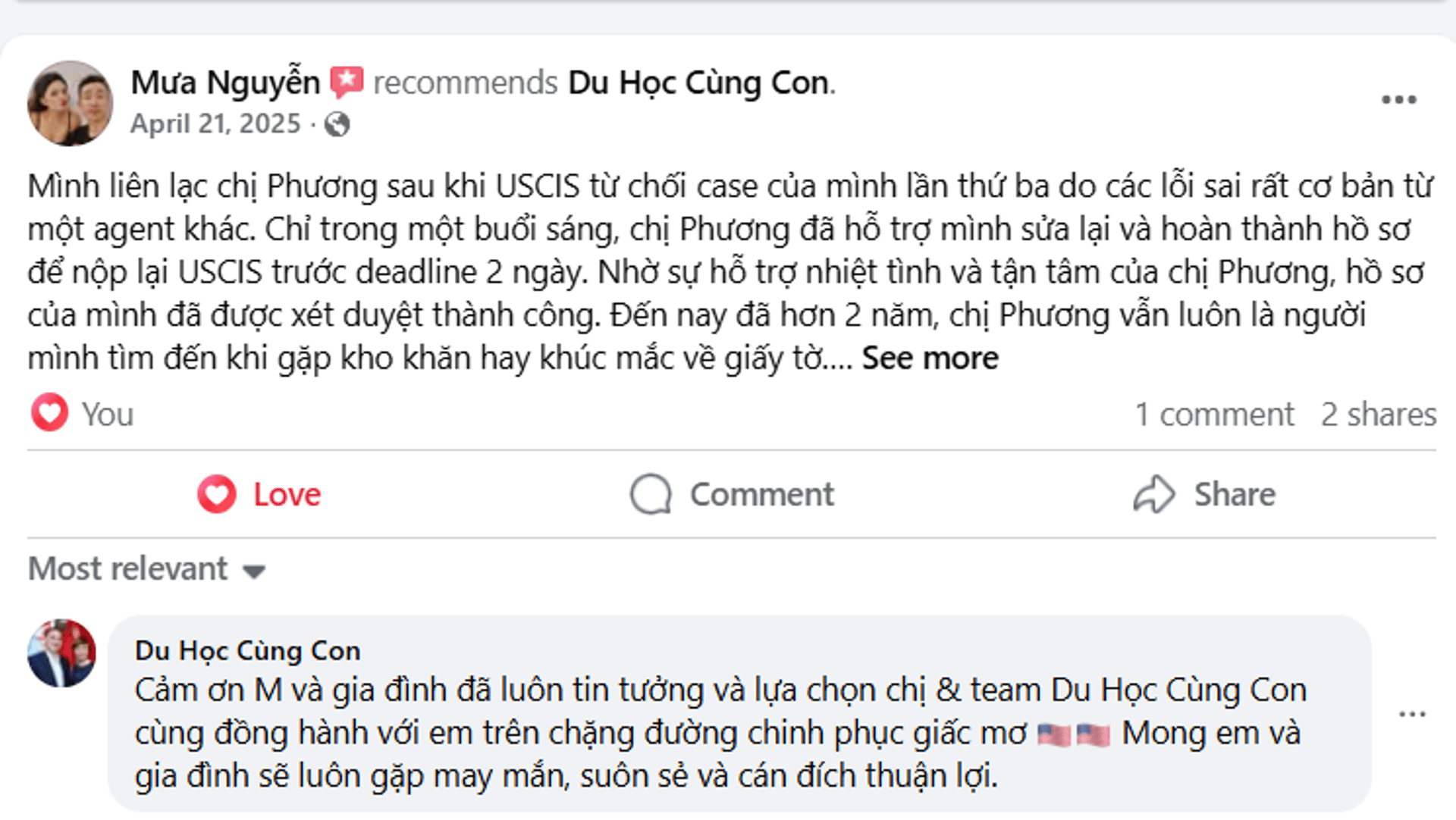 Mình liên lạc chị Phương sau khi USCIS từ chối case của mình lần thứ ba do các lỗi sai rất cơ bản từ một agent khác. Chỉ trong một buổi sáng, chị Phương đã hỗ trợ mình sửa lại và hoàn thành hồ sơ để nộp lại USCIS trước deadline 2 ngày. Nhờ sự hỗ trợ nhiệt tình và tận tâm của chị Phương, hồ sơ của mình đã được xét duyệt thành công. Đến nay đã hơn 2 năm, chị Phương vẫn luôn là người mình tìm đến khi gặp kho khăn hay khúc mắc về giấy tờ. Và vẫn như lần đầu tiên, với sự chuyên nghiệp và kiến thức sâu rộng của chị, chị Phương đã giúp mình từng bước tiến gần đến giấc mơ Mỹ hơn. Em cảm ơn c Phương và team của chị rất nhiều!