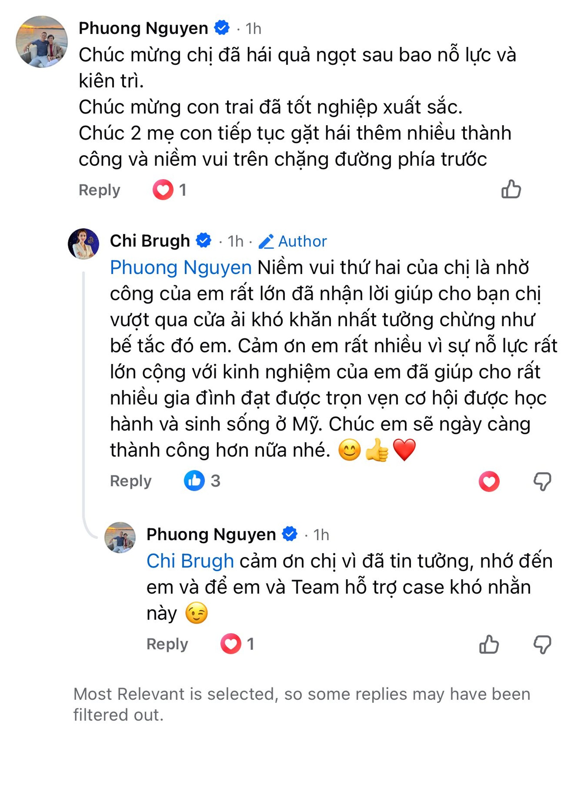 Cảm ơn em rất rất nhiều vì đã giúp cho bạn chị - một case gần như không còn cơ hội, nhưng em đã làm được và chị tin là như thế. Công việc nào cũng có thành công hoặc thất bại, cũng có may mắn hoặc thất vọng vì không được như mình mong muốn, nhưng những người làm công việc về lĩnh vực di trú như chị em mình thì không thể biết trước được là sẽ như thế nào vì tùy thuộc vào nhiều yếu tố khác từ khách hàng, thay đổi luật từ USCIS, hoặc cũng có khi tùy vào tình hình khách quan hoặc cảm tính …..Nhưng mình cứ cố gắng làm hết khả năng có thể thì dù có đạt được sự may mắn hay thất bại thì mình cũng không phải hối tiếc khi mình chưa làm đúng không em. Chị chúc em sẽ gặt hái thêm nhiều thành công hơn và ngày càng có thêm nhiều gia đình sẽ có duyên được em đồng hành để con đường đến nước Mỹ sẽ dễ dàng hơn và bình yên hơn nhé.