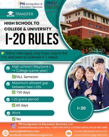 Thời gian gián đoạn giữa I-20 của trường trung học và I-20 của trường mới không được vượt quá 5 tháng (150 ngày) theo quy định của SEVIS.